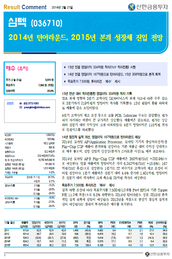2014년 턴어라운드, 2015년 본격 성장세 진입 전망 - 신한금융투자
